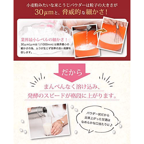 水にまんべんなく混ざることによって、甘酒や塩麹を作る時に粒がない分ムラが少なく効率よく発酵するので 誰でも簡単に失敗せずに作れるんです!